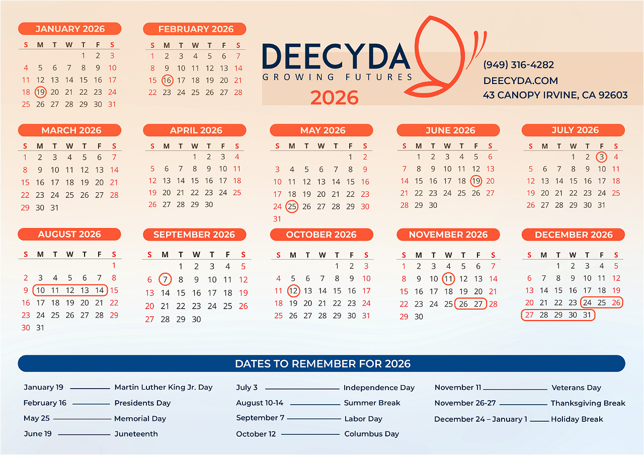 If any of these holidays fall on a Saturday or Sunday, DeeCyDa will be closed on the Friday before that weekend.